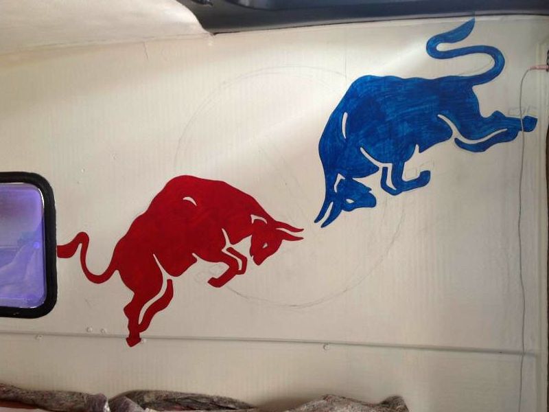 Start"Bayern-München" - Logo "Vfl Wolfsburg" - Logo Wohnwagen "Red Bull" |